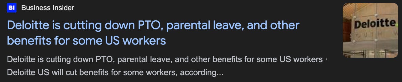 Deloitte is cutting a lot of their generous benefits (parental leave from 16 to 8 weeks, reduced PTO, pension plan frozen, etc). There will be more companies that follow…