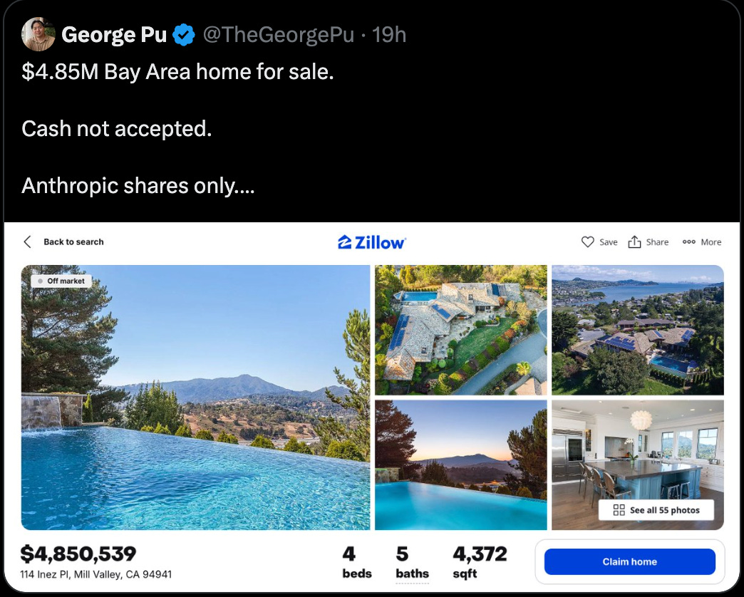 The seller is a banker and really wants some Anthropic stock…This used to be a joke, but now homes in the Bay Area are being priced with pre-IPO equity.