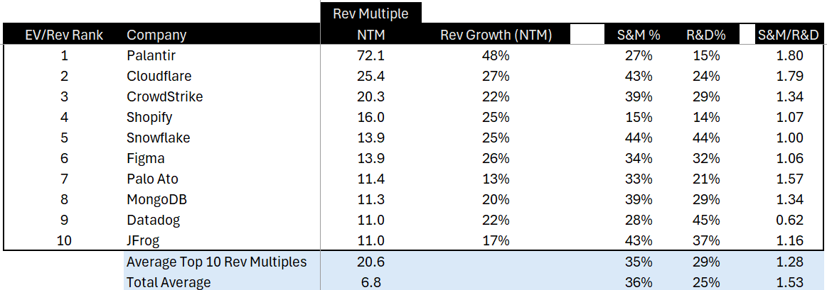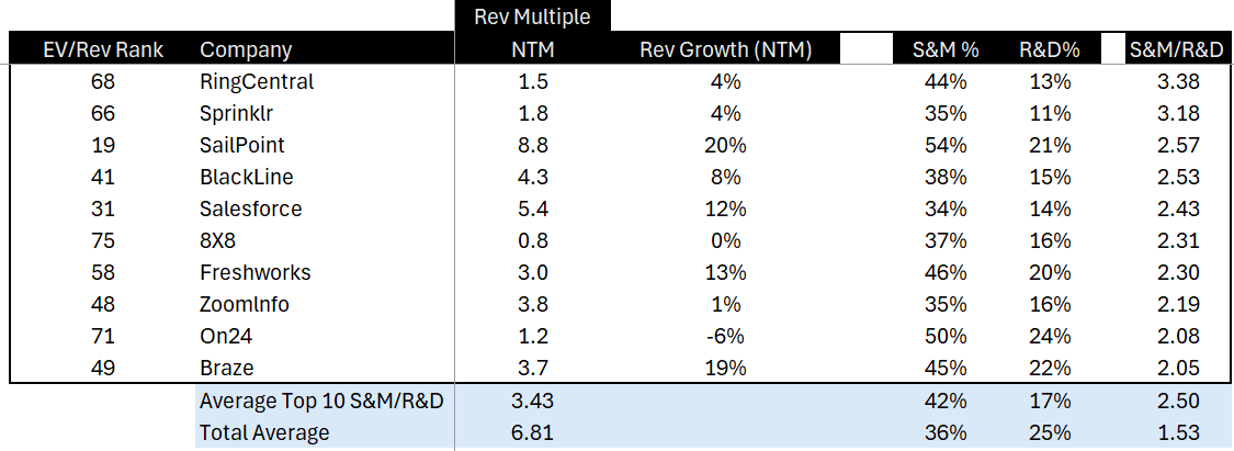 The companies with the highest S&M spend relative to R&D have a much lower valuation multiple (3.4x) than the general average (6.8x). These 10 companies on average spend $2.50 on S&M for every $1 on R&D!