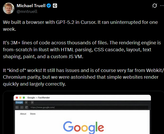 Below is Cursor’s CEO saying they just built a browser clone by letting Cursor run uninterrupted for one week straight. It created 3M+ lines of code…And it works! 🤯