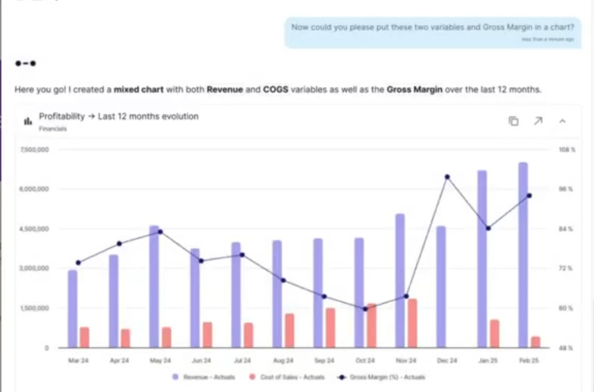 Below is a prompt to show a gross margin analysis over time. Instantly create a chart based on actual and forecasted data. Once you get a chart you like, you can just tell AI to add the chart to a dashboard so you always have it.