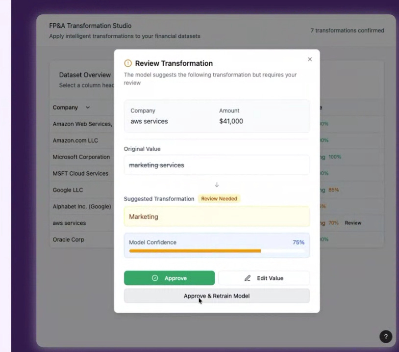 The below shows how Abacum’s AI classifier finds the anomaly and then suggests that the user re-categorize the forecast so it will match with actuals going forward.