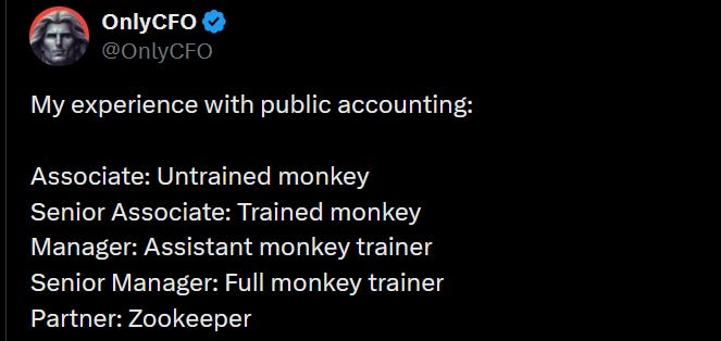 With current AI tools and processes, I could easily see 60%+ of audit work being automated that is currently done by humans. Why do I think that? Well, 60% of the work is done by Associates and Senior Associates (0-4 years of experience) and the work they do could easily be done by a monkey…