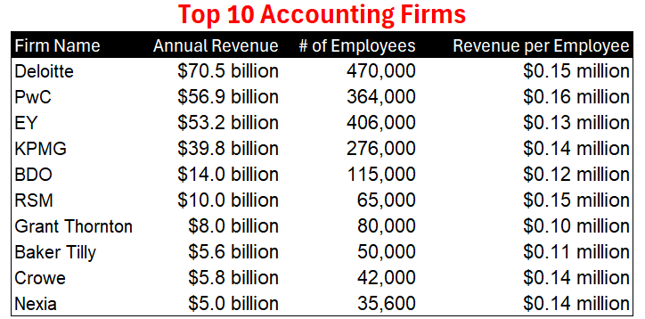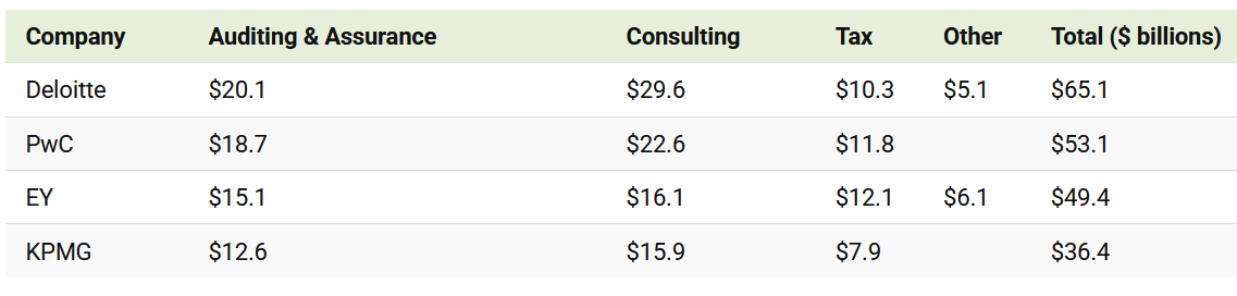 Accounting firms generate ~50% of their revenue from audit and tax, which are both easy targets for AI. The business breakout below is from 2023 (similar breakouts today as well).