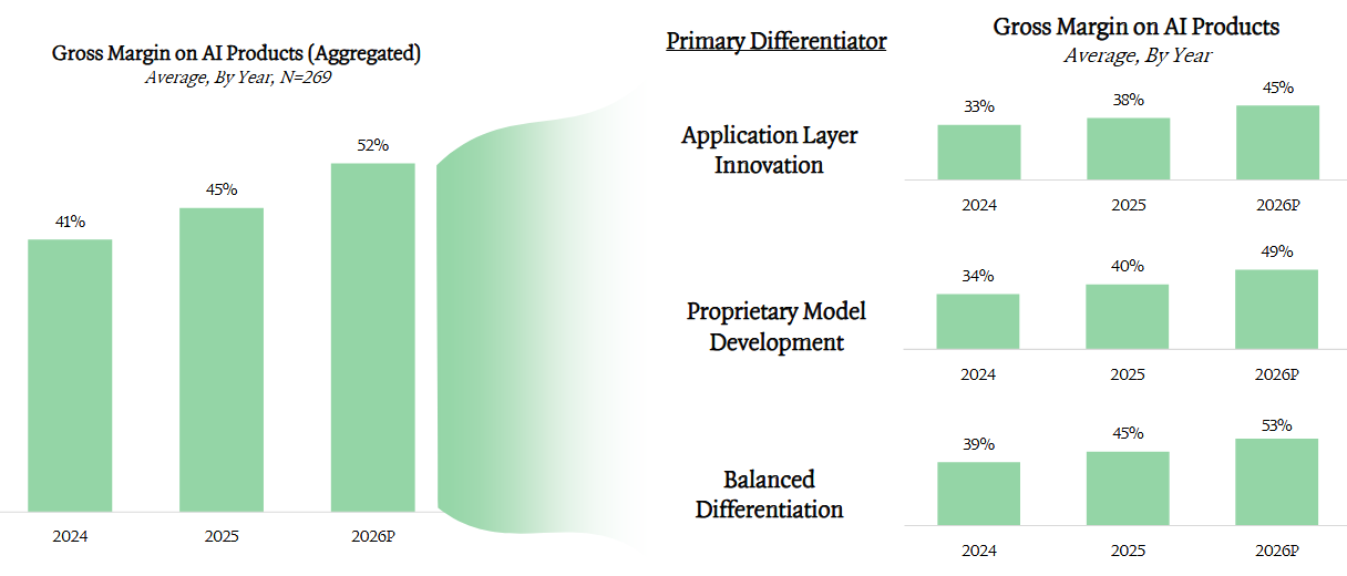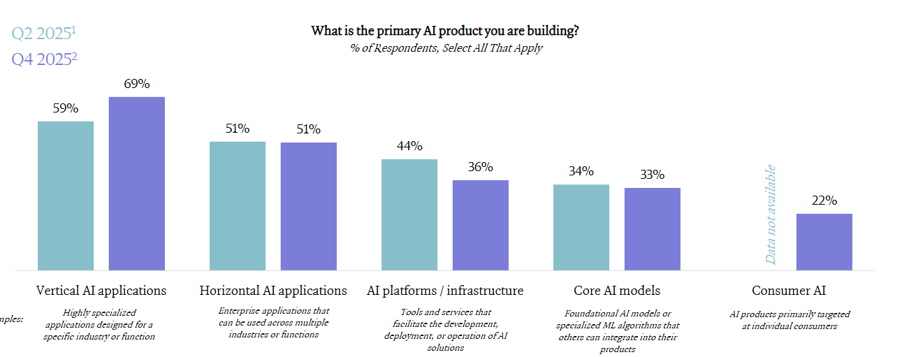 Nearly 70% of companies are building vertical AI applications, reinforcing that durable value is being created through domain-specific workflows rather than generalized intelligence.