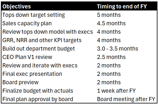 Below is a rough timeline I use for annual planning. The larger (more predictable) the company, the easier it is to start earlier. Earlier-stage companies can/should compress this timeline a bit given how much can change in a couple of months.