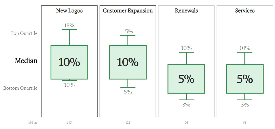 The medians are fairly consistent from when ICONIQ did this benchmark a year ago, but the bottom and top quartile amounts are higher - for new logos the bottom quartile is 2 percentage points higher and the top quartile is 6 percentage points higher. Reps are getting paid more relative to revenue brought in…