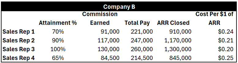 Company B is acquiring ARR 34% more efficiently than Company A! This is why your best reps are SOO valuable. Not only do they close better deals, but the reps with high attainment are a lot more efficient because the incremental dollars only cover commissions (versus base salary + commissions).