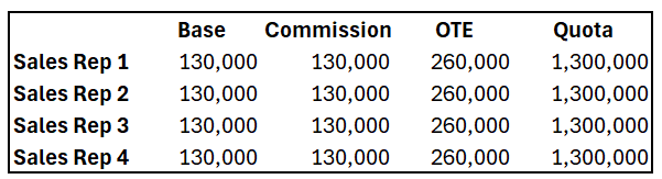 Let’s look at how attainment impacts sales efficiency with an example of two different companies with 4 sales reps. Below are the sales reps’ OTE and quota.