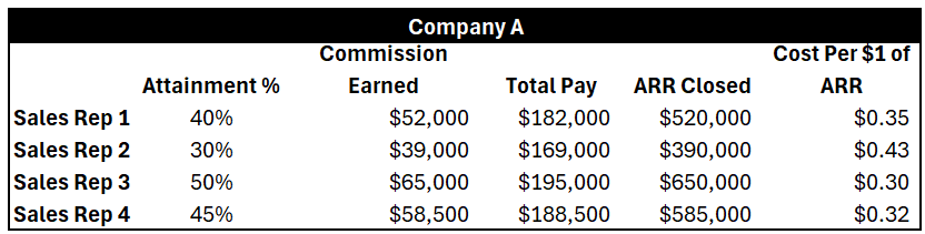 Company A has a low average attainment of 41%. The far right column shows the total sales rep cost per $1 of ARR closed (e.g. it costs $0.35 in payroll costs for sales rep 1 to close $1 of ARR).