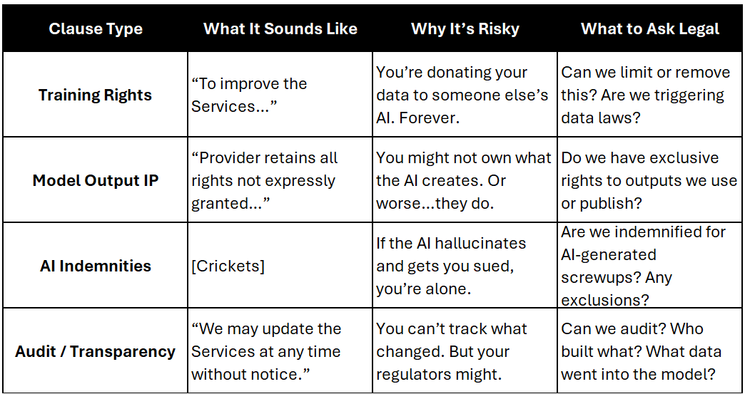 Here are four AI contract clauses worth asking Legal about before someone clicks “accept.”