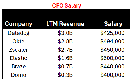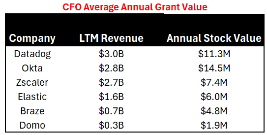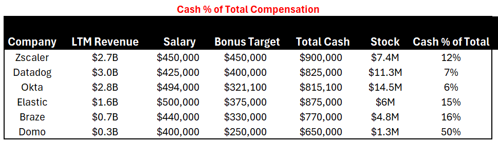 As I said before, executive compensation is heavily weighted toward equity. The below example, from CrowdStrike, shows that <7% of CrowdStrike’s executive compensation is from cash (salary and bonus). If you exclude the CEO, then it’s probably closer to 10%, but the CFO would still have 90% from equity…