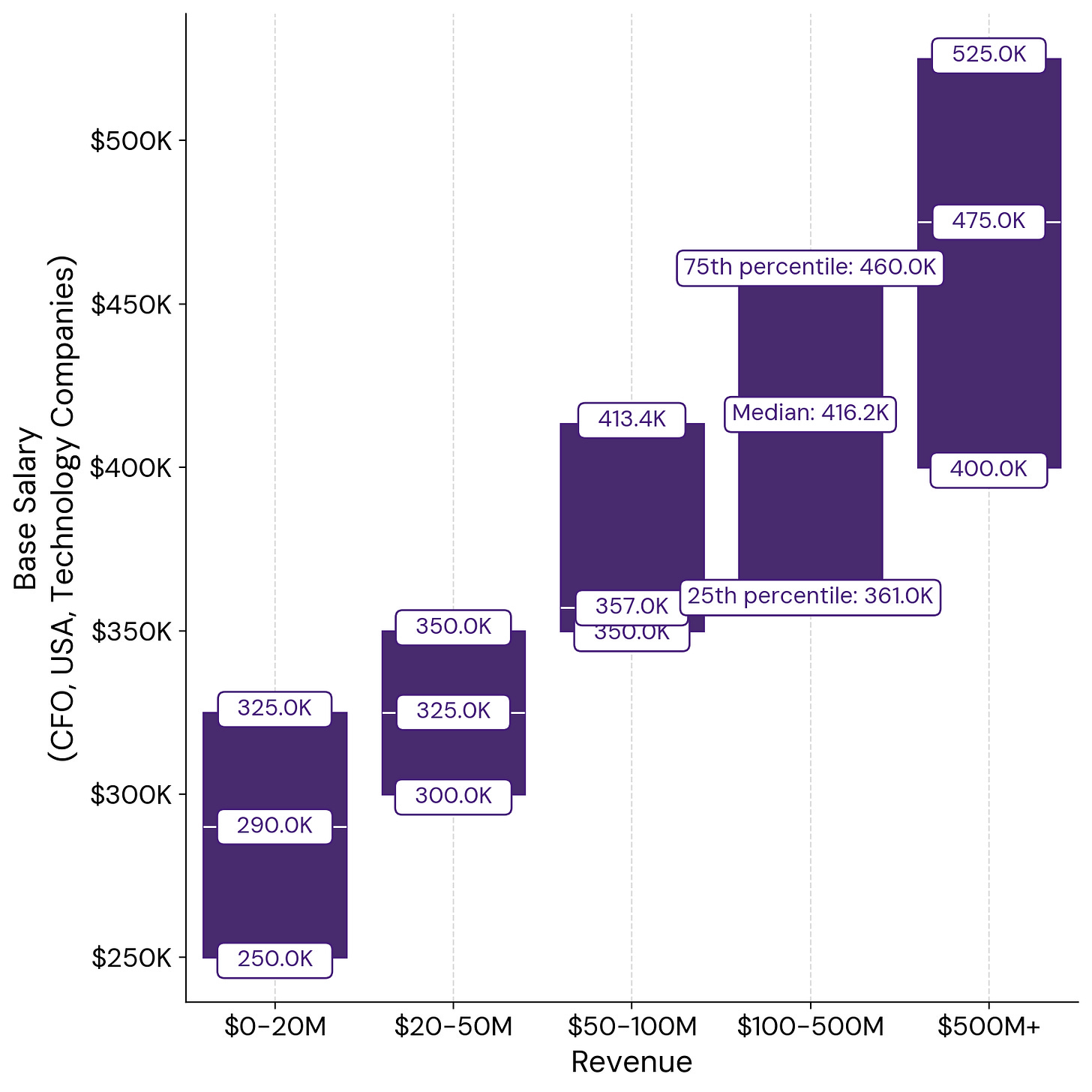 The CFO you typically need at $25M is not the same one you need at $500M, near an IPO, or at a large public company. Someone can grow into the different phases, but presumably that means they have proven they can scale with the company to the next level and then require a higher salary.