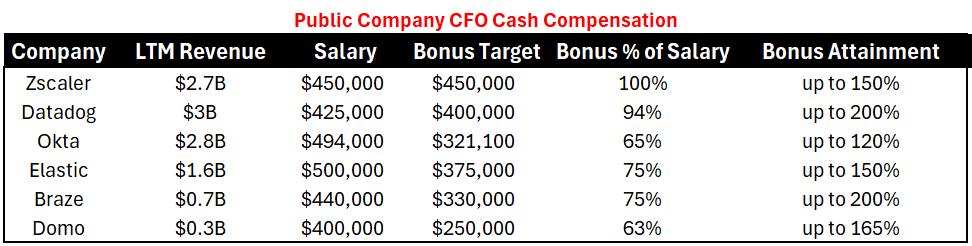 Below is several public companies with varying revenue ranges and the cash compensation for their CFOs. The bonus attainment column shows the highest possible bonus achievement if the company hits the highest targets.