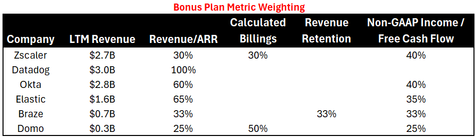 Datadog is the only company below with 100% weighting on growth but two notes on that: 1) they are already generating ~28% FCF margins and 2) they have decelerators if non-GAAP operating income falls below a certain target.