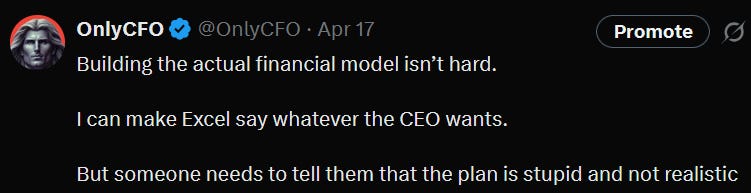 Building a financial model that incorporates all these things is NOT hard. Any Excel monkey can build what your overly optimistic CEO wants. That’s the easy part.