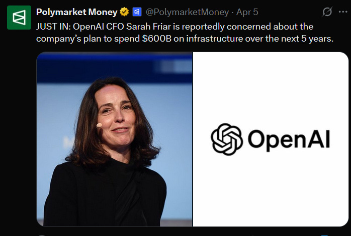 OpenAI CFO has reportedly expressed concerns about their massive spending and the IPO timeline being discussed. She is trying to keep her fiduciary duties by communicating concerns about the CEO’s targets. Good for her. Many CFOs just shut up and nod to whatever the CEO says.