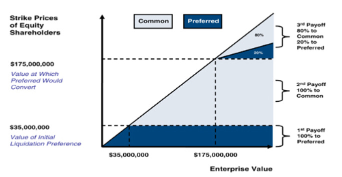 In the example below, anything between a $35M and $175M acquisition price doesn’t impact the VCs financially. They get the same amount either way in an exit. But common stockholders start to benefit after $35M. If the VC Director isn’t fully wearing their fiduciary hat they might see a $35M acquisition offer and be quick to accept it because they know there is no way the company is worth more than $175M so they would rather take the guarantee now.