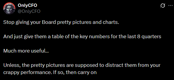 I know this goes against what many of you present to your boards….but PLEASE stop presenting pretty charts and graphs that give only a fraction of the information in a good table of numbers.