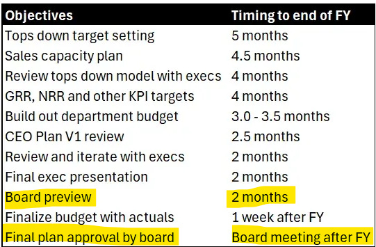Below is my annual planning calendar for a more stable company with some decent revenue scale. Early-stage company timelines are usually more compressed with a few more board touchpoints given how fast things move.