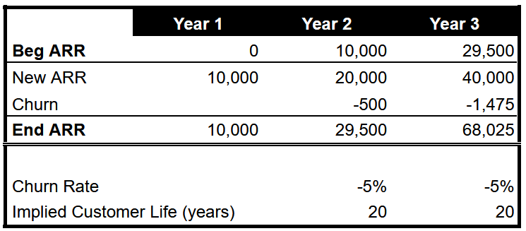 Let’s say in the early days the company did an amazing job selling to their target customer. For the first 3 years of business, the annual customer churn is only 5%.