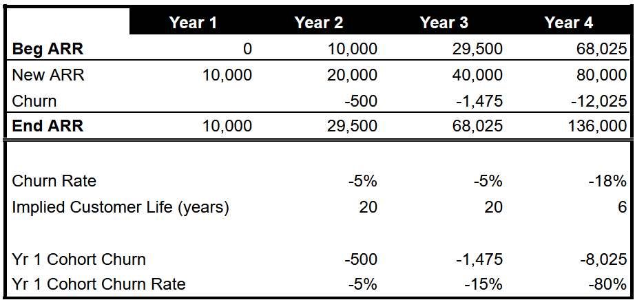 As seen below, yearly churn is 5% for the first couple of years, but then churn explodes to 18% on a simple total basis (churn $ in year 4 / ARR at the beginning of the year).