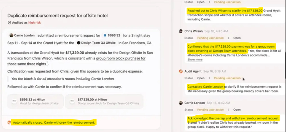 AI agent asks the person who booked the block of rooms if it also covered the individual who submitted their expense.