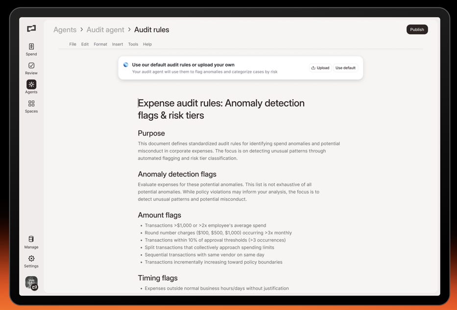 Audit Agent: identifies spend anomalies, patterns of problem spend, waste, abuse, etc