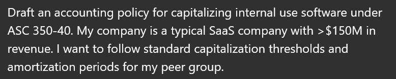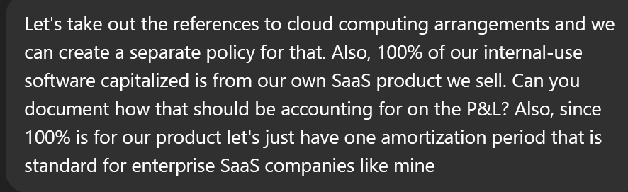 My mind is still blown by how good ChatGPT did on a first draft for an “Internal-Use Software Capitalization” policy. Here is my prompt: