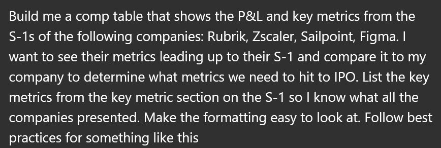Below I asked ChatGPT to build a table that shows key metrics of comparable companies that recently went public so you can compare to your company and the metrics you need to IPO.