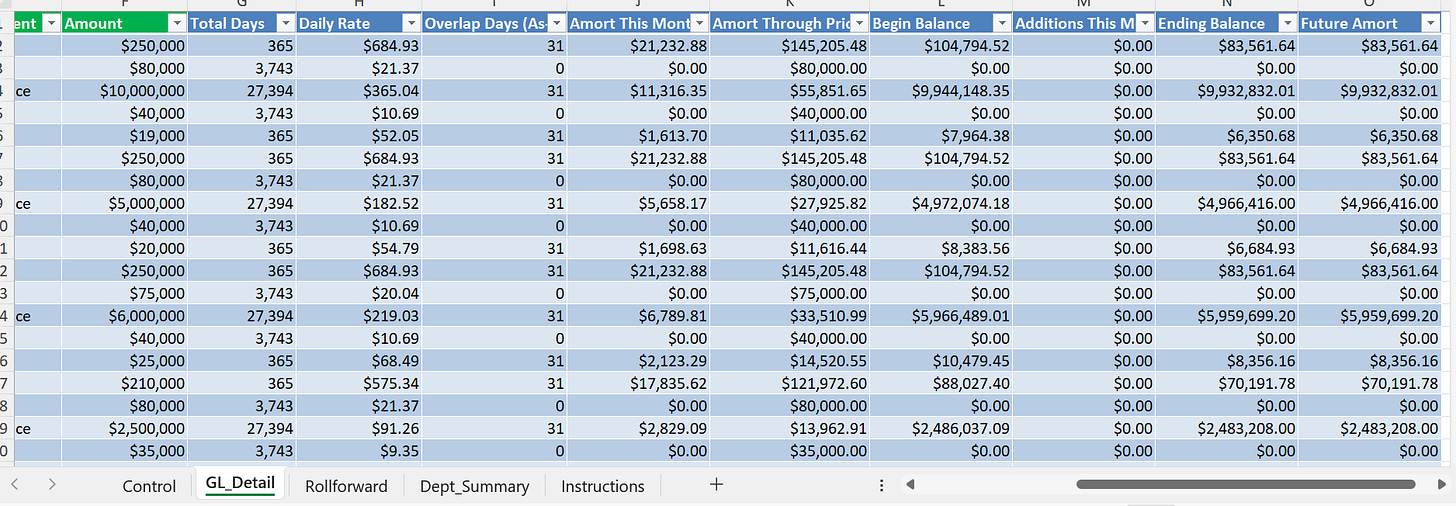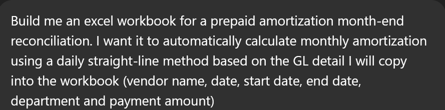 Let’s say accounting didn’t have a prepaid amortization workbook. I can just ask ChatGPT and it can spin one up with formulas based on my policy and everything.