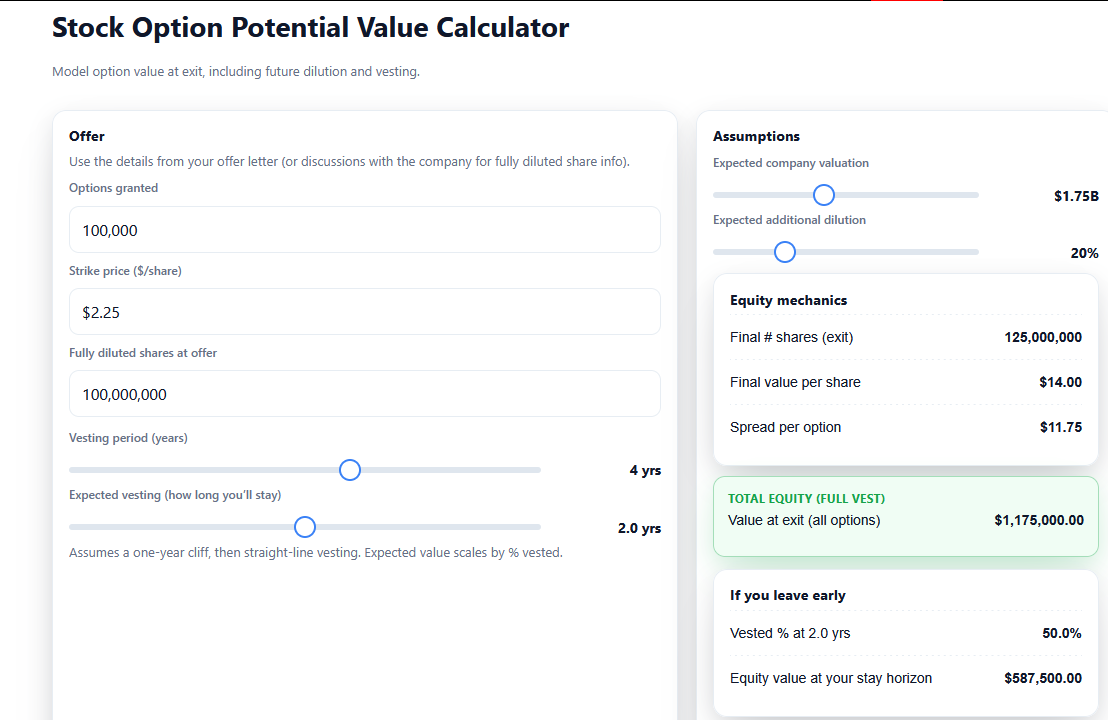 In less than 1 hour I built a web app that you can share with candidates/employees to help them think through the potential value of their stock options! It’s not super complicated (just need to know the logic) so even someone like me can “vibe code” it.