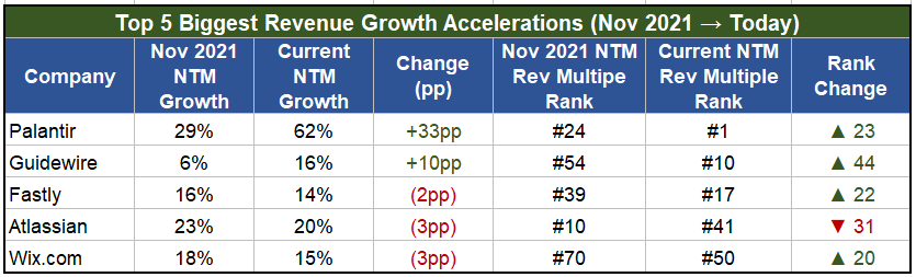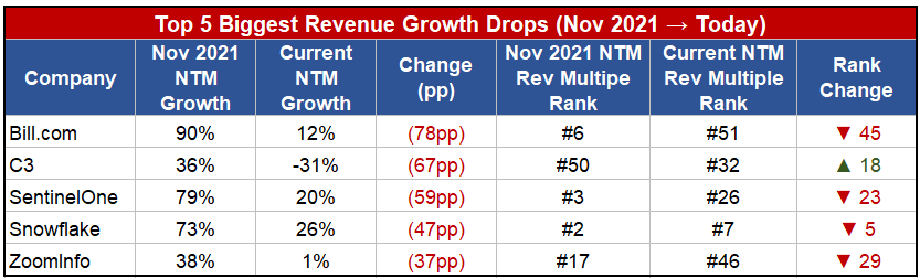 Let’s look at the companies that had the largest revenue growth rate drops since 2021 (the glory days of SaaS). To measure the impact, I look at the relative “NTM Rev Multiple Rank” change from each period.