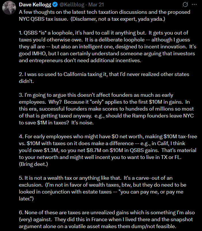 New York is advancing a proposal to decouple from federal QSBS, which is the tax provision that lets startup founders exclude gains on qualifying exits. It’s can be a fantastic tax benefit.