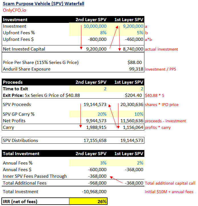 I don’t know all the details with the Anduril SPV. I made some assumptions on the 1st layer SPV because we didn’t have details about it. Maybe the 1st layer SPV has 0 carry and 0 fees. That would certainly make the economics better but even the 2nd-layer SPV high upfront fees, annual management fee, and high price per share being paid still makes it appear VERY expensive.