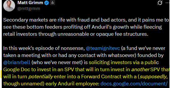 Matt Grimm, Co-founder of Anduril (super hot private company) put a VC on blast last week because of a scammy looking SPV claiming exposure to Anduril stock that was littered with red flags.
