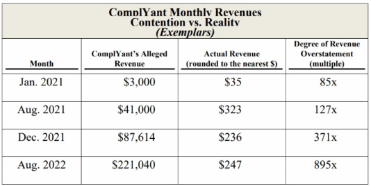 Fake revenue growth numbers. Claimed monthly revenue got up to $250,000 when in reality the average monthly revenue was only $250. Just a 1,000x inflation of revenue…lol