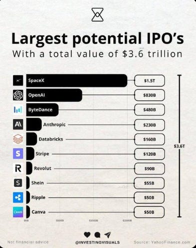 2026 might be a blockbuster year for IPOs, but it will be because a handful of massive companies with fantastic metrics and story go public. The below shows the largest potential 2026 IPO candidates. These companies will drive most of the excitement and IPO volume.
