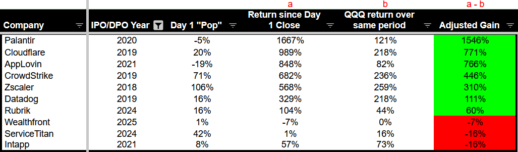 Only 7 cloud companies that have IPOed since 2018 (of the 52 that I am tracking) have beaten the QQQ ETF over the same time period since they went public.