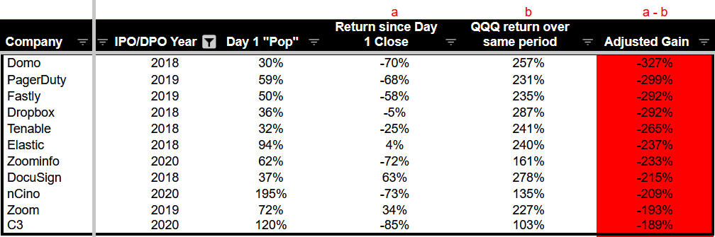 The average QQQ adjusted return of all these cloud IPOs since their Day 1 IPO close is -42% 🤮. When returns are that bad, public market investors are going to be very cautious with similar IPOs.